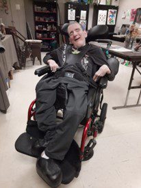 Speckled Crab was created by looking through several images of crabs with Gary choosing this cutie. He painted the background independently with neutral colors, adding a few dashes of color for fun. With the art facilitator’s assistance, he painted the crab with matching colors creating an abstract piece that is beyond adorable.