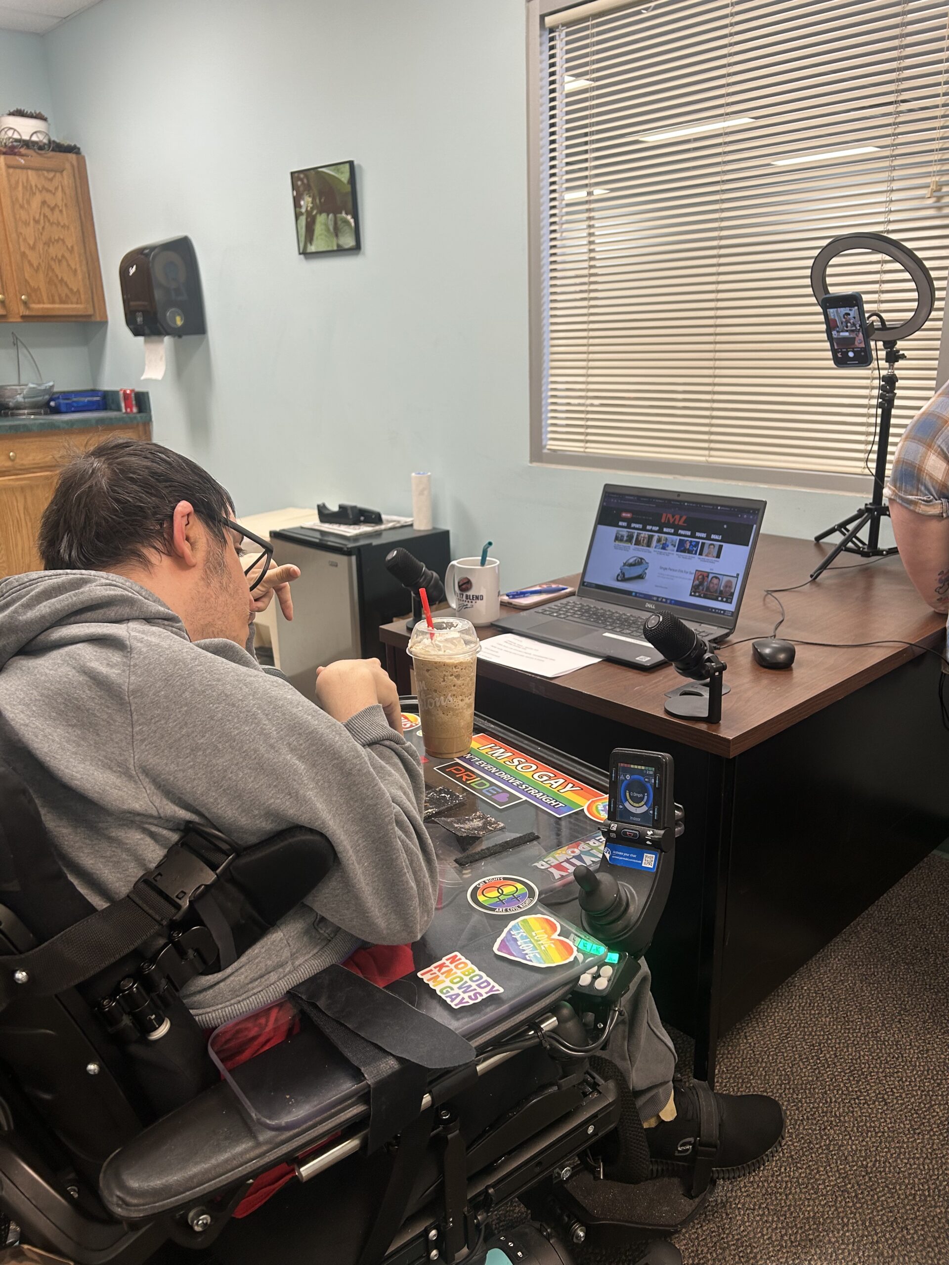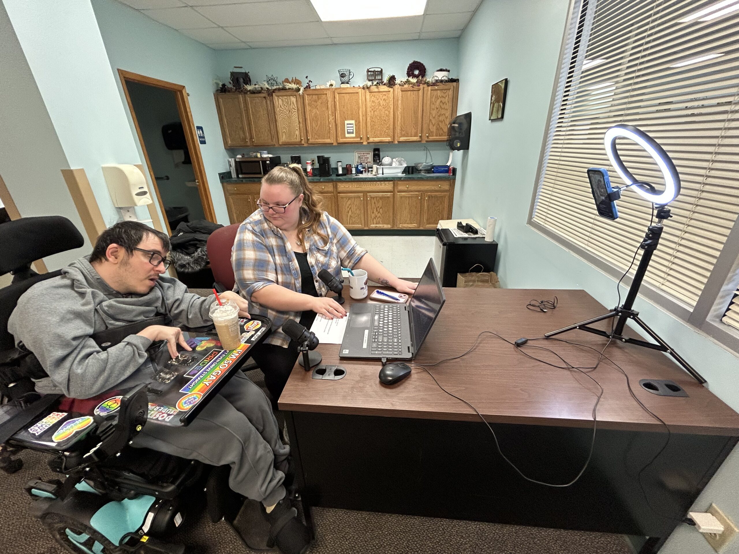 In front of him sits a coffee, his notes, a microphone, and a ring light. He spent the morning browsing TMZ and other celebrity gossip sites, gearing up for the moment the clock strikes 10—when he goes live. His staff member, also his co-host for the day, reaches up to hit the start button, and a 3-2-1 countdown appears on Matt’s phone. It’s another Friday at Aspire of WNY’s Tech Today Day Hab Program in Tonawanda, New York, and Matt Wolf is on air for another episode of The Matthew Wolf Show.
