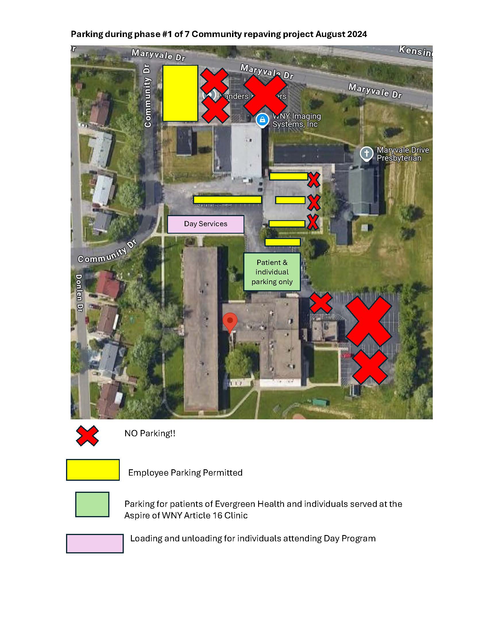 Parking has been negotiated with our neighbors, the CPA firm up front, and the church next door. You can also park in the other designated areas of Aspire of WNY’s parking lot outside PHASE ONE. Street parking, according to local law, is also a possibility. To help understand where Aspire of WNY associated persons can park, please refer to the attached diagram. Absolutely no parking should take place in the indicated areas. Yellow areas are for staff, vendors & visitors. Pink and green areas are for individuals supported within Day Services, Evergreen Health, and the Article 16 clinic.